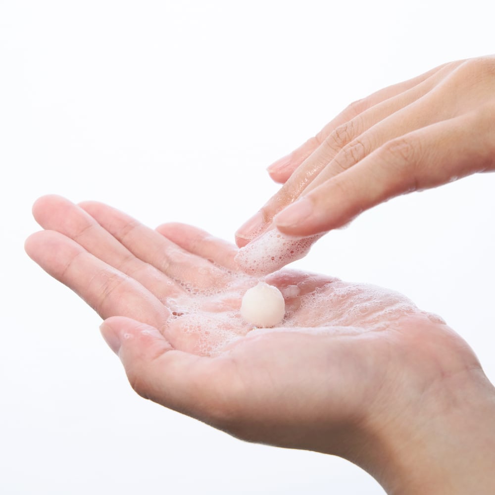 ラベルをはがして中のボールを取り出し、適量のぬるま湯でボールを溶かしながらよく泡立てます。