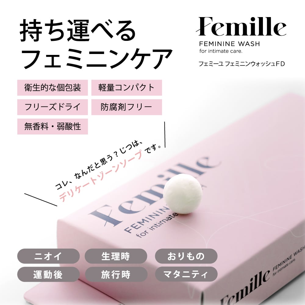 フェミーユ フェミニンウォッシュFD は、デリケートゾーン(外陰部)の洗浄に最適な成分(弱酸性洗浄成分、乳酸菌、保湿成分等)をフリーズドライ(凍結乾燥)ボールに凝縮しました。