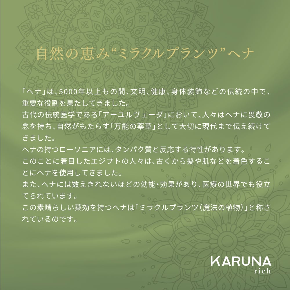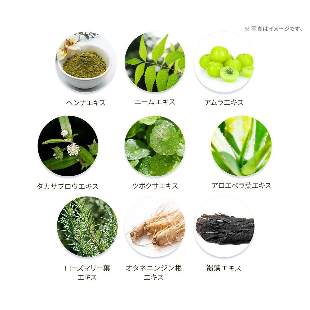 水/グリセリン/ヤシ脂肪酸グリセリル/オリーブ油/スクワラン/アボガド油/ローズマリー葉エキス/ヒアルロン酸Na/ヘンナ/ニームニキス/アムラエキス/タカサブロウエキス/ツポクサエキス/センブリエキス/チョウジエキス/オタネニンジンエキス/王剛エキス/褐藻エキス/ベルガモット油/BG