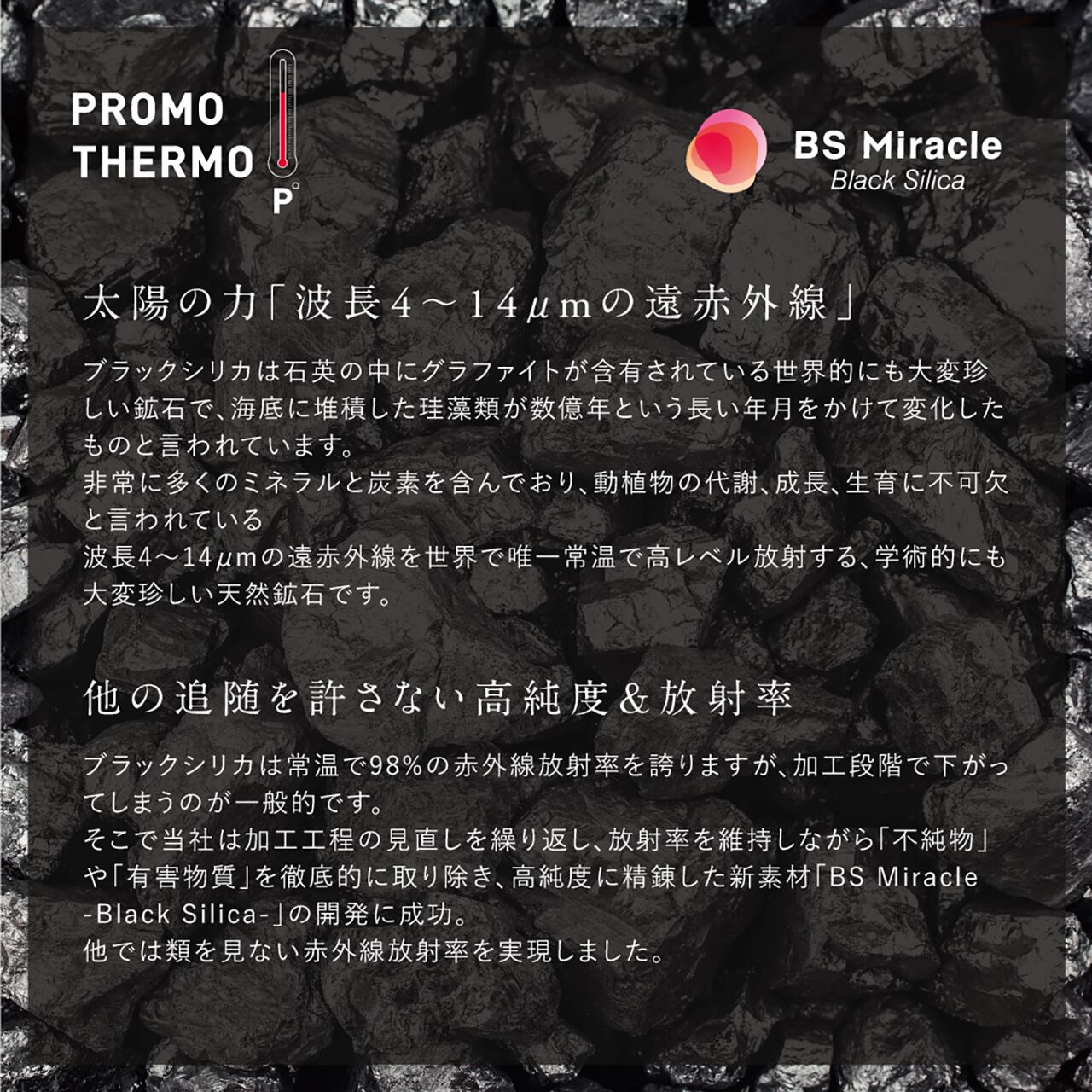 国内では唯一北海道上ノ国町のみで産出され、太陽エネルギーを吸収・蓄熱して、動植物の代謝や成長、生育に不可欠と言われている波長4〜14μmの遠赤外線を常温で高レベル放射している、学術的にも大変珍しい天然鉱石です。